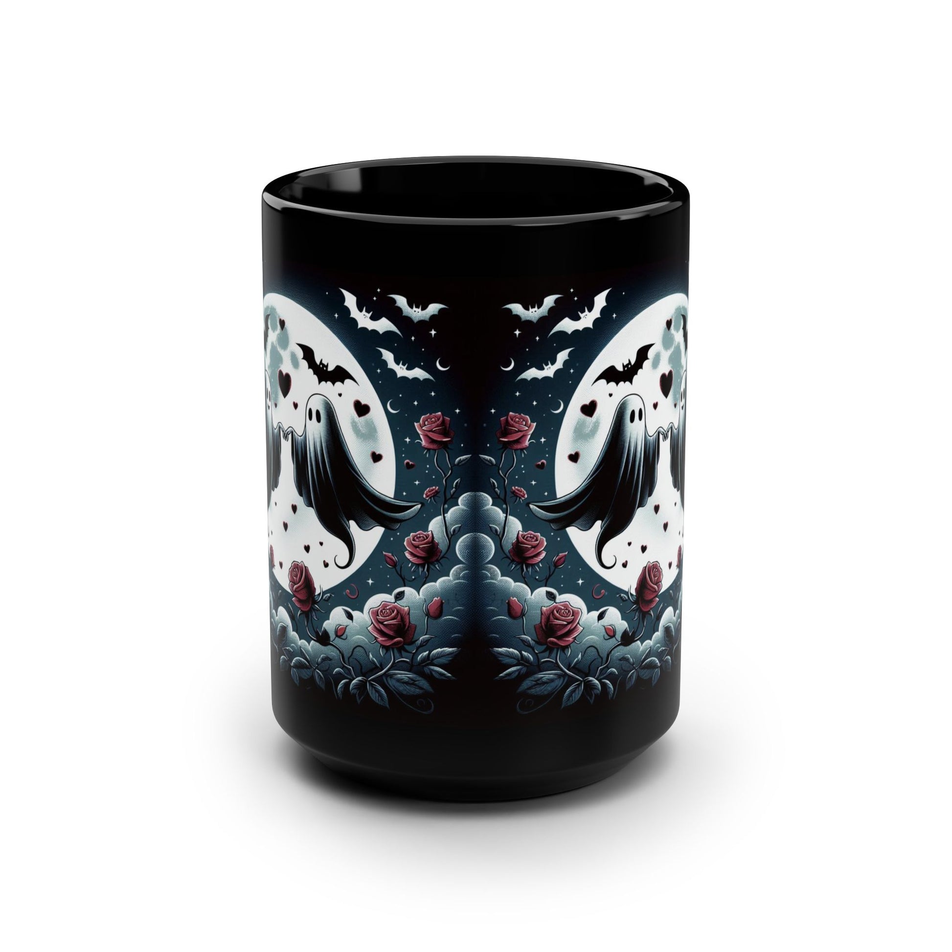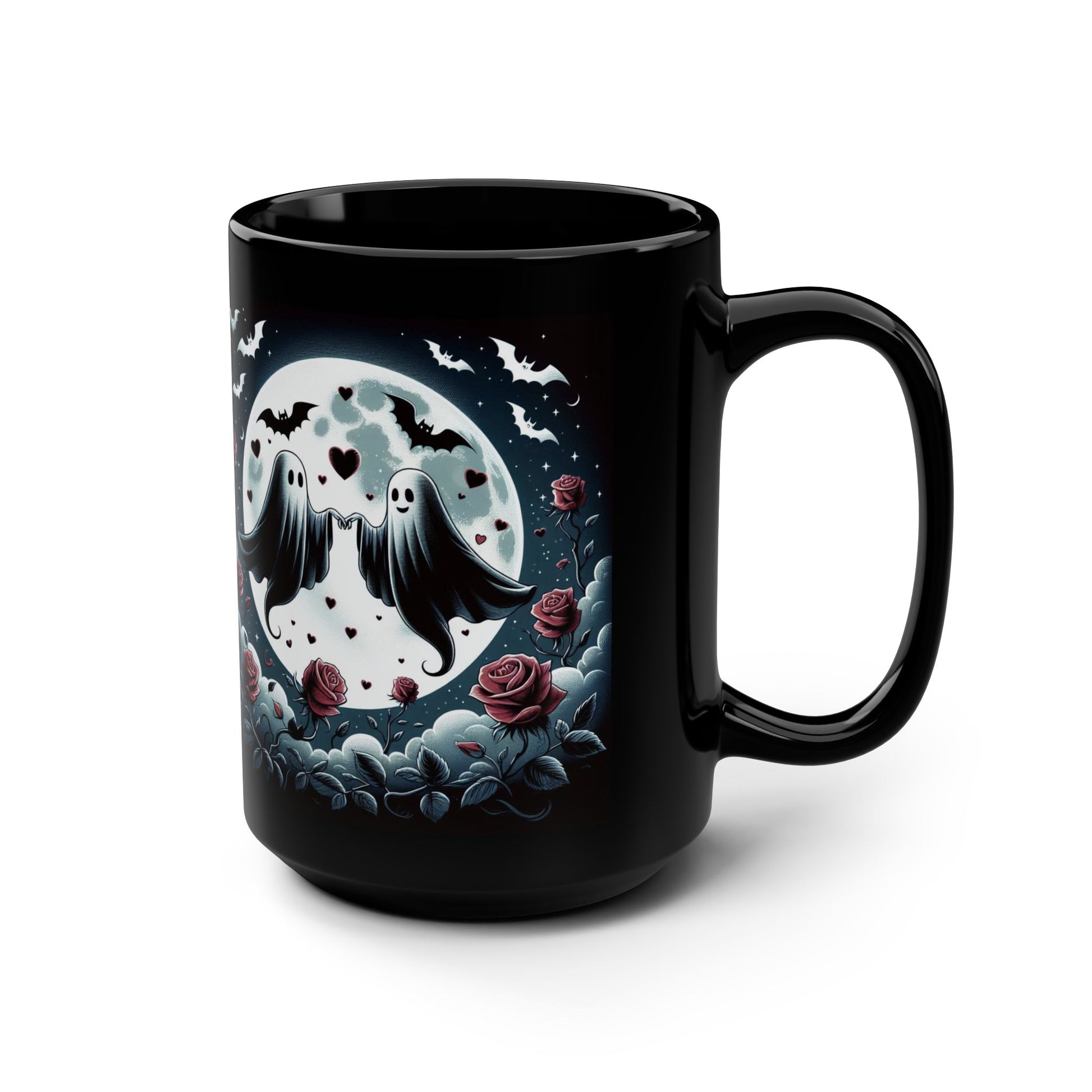 A black 15oz ceramic mug with a glossy finish, featuring a Halloween and Valentines mash up design.