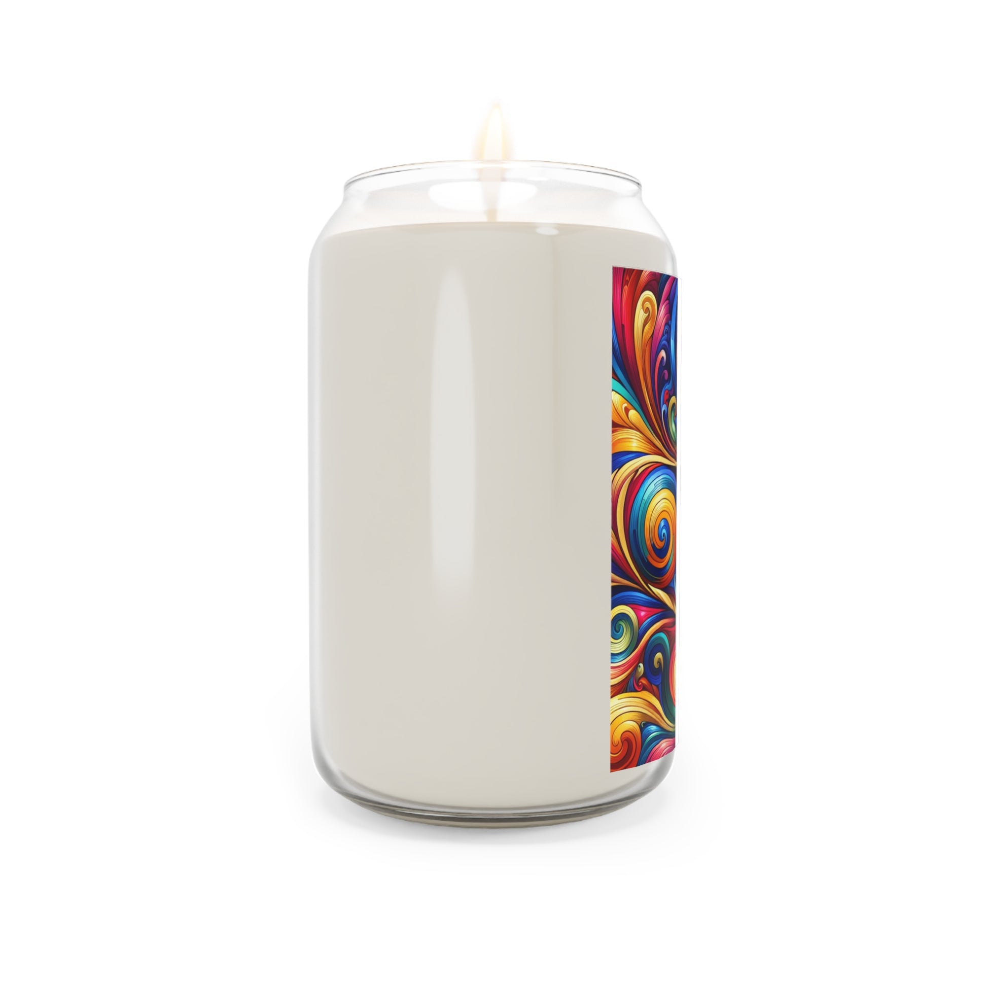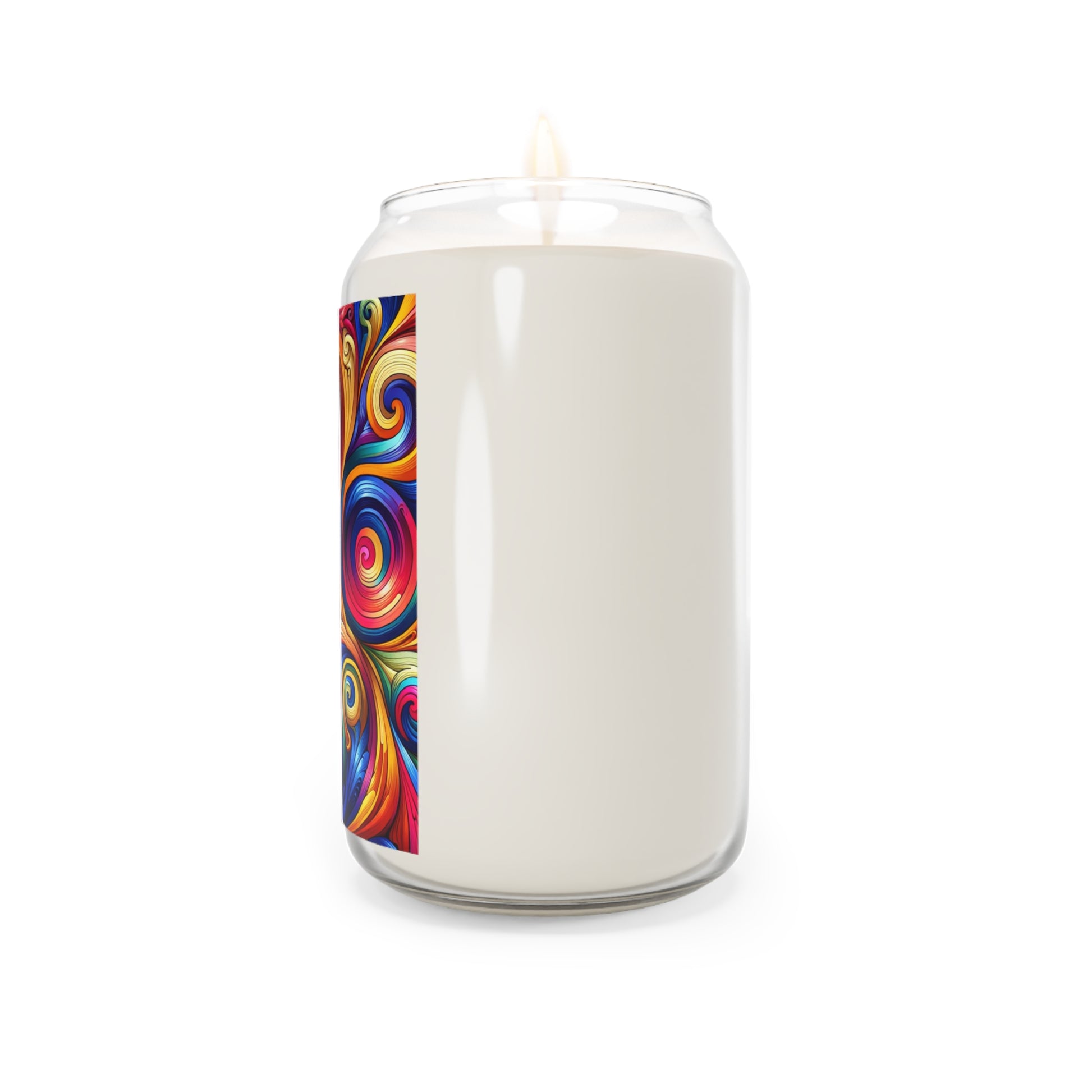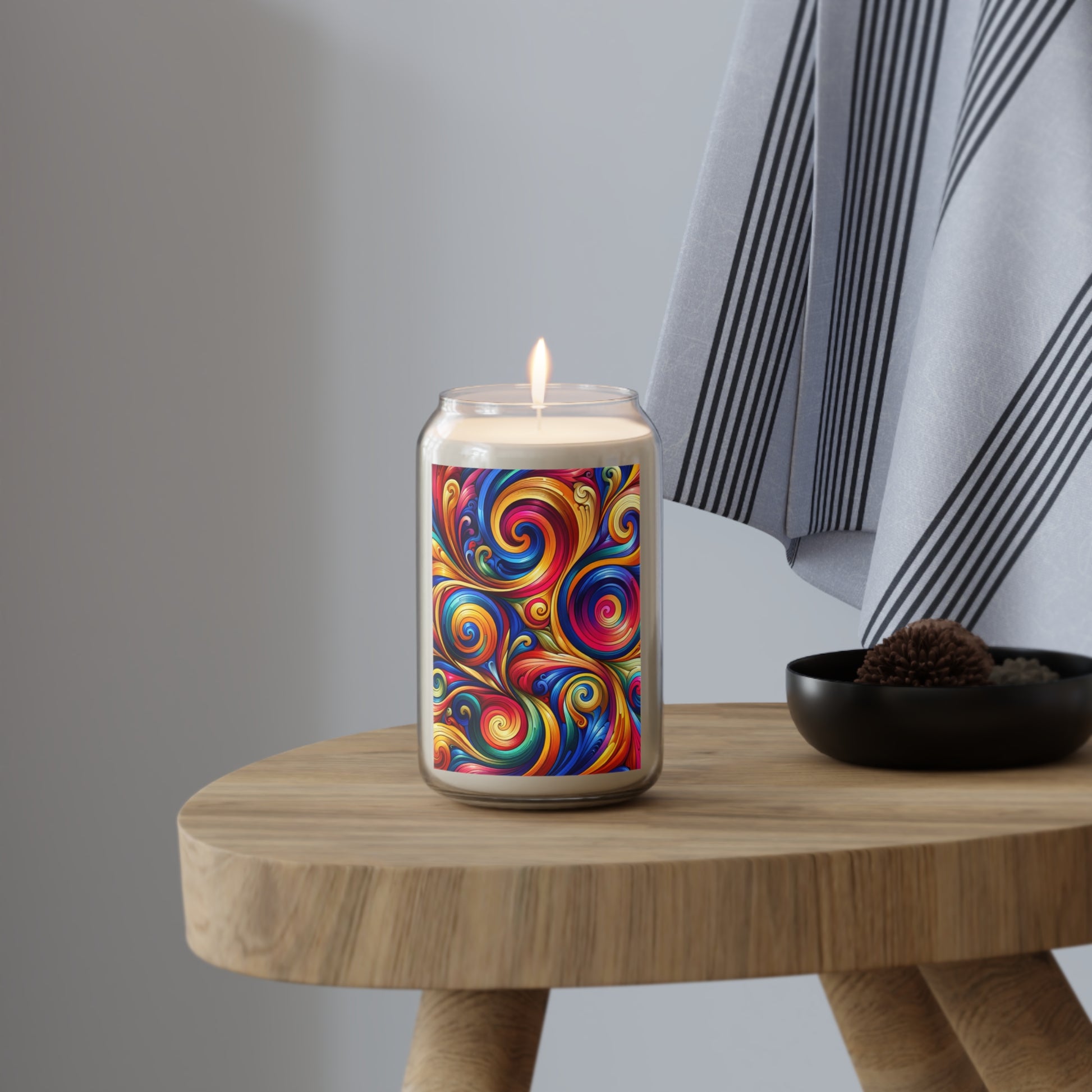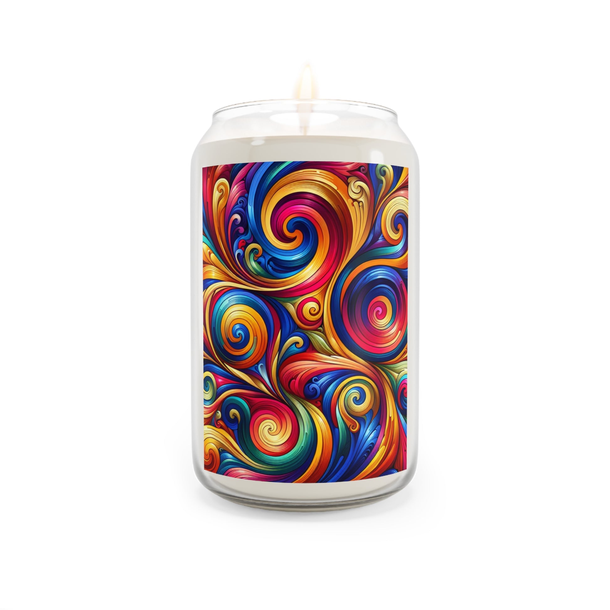 A scented candle with colorful swirls that add a touch of whimsy to any room.