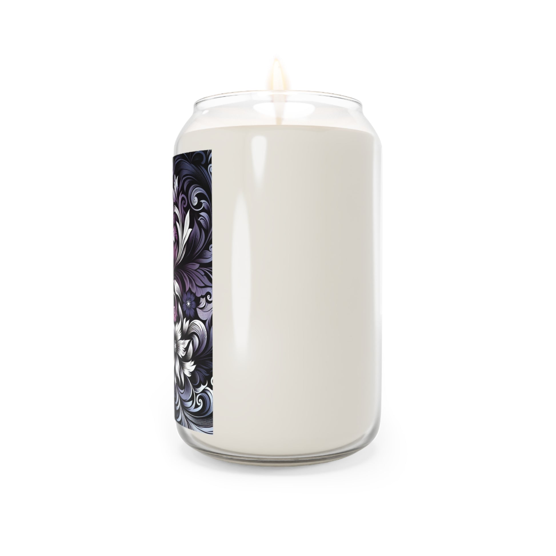 A scented candle with a purple floral pattern that adds a calming and relaxing ambiance to any room.