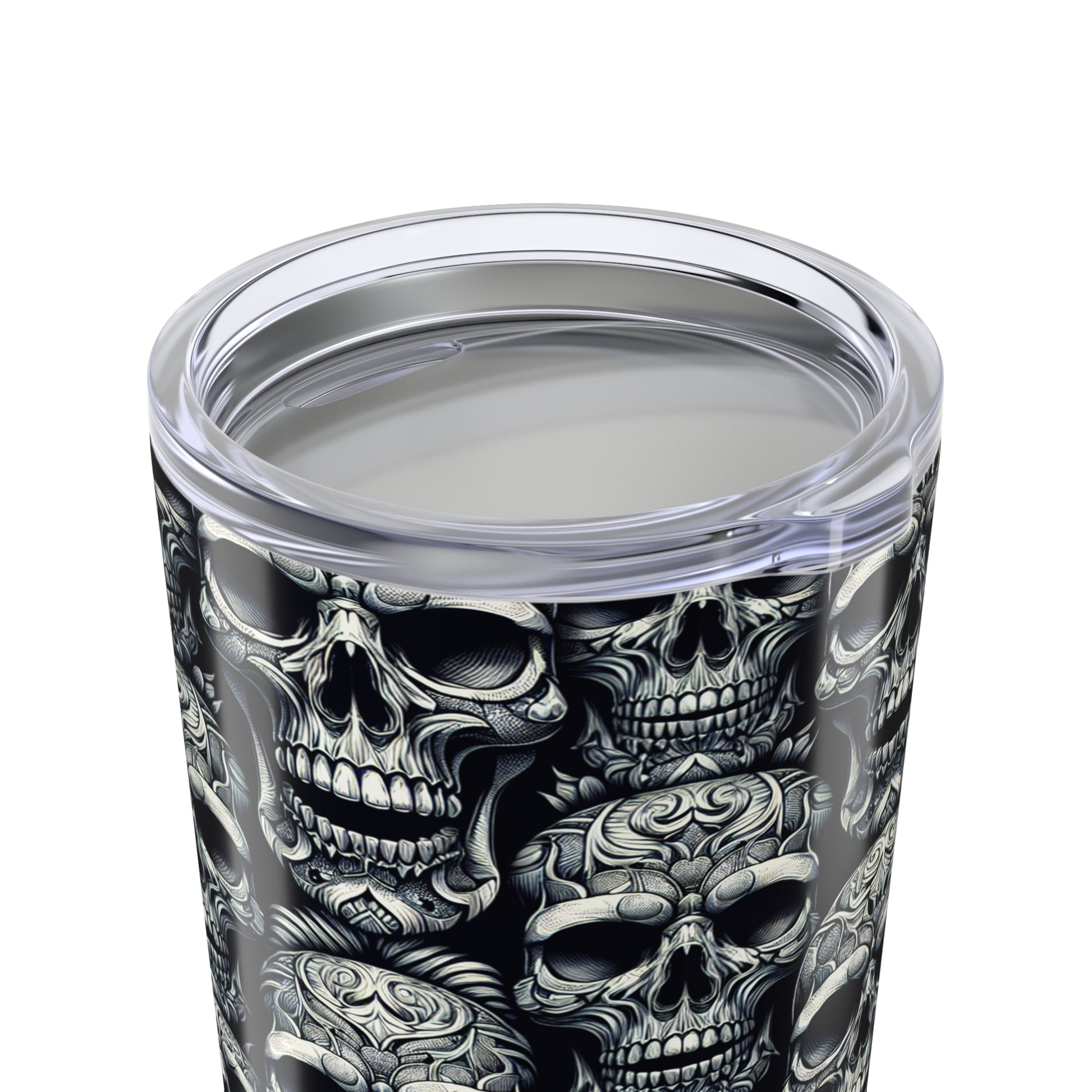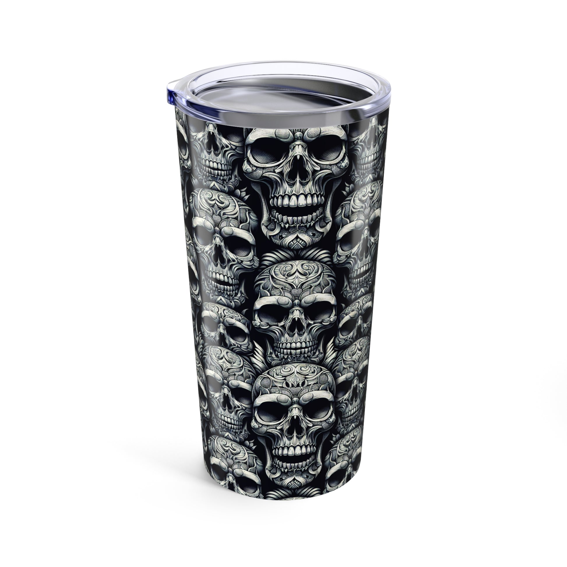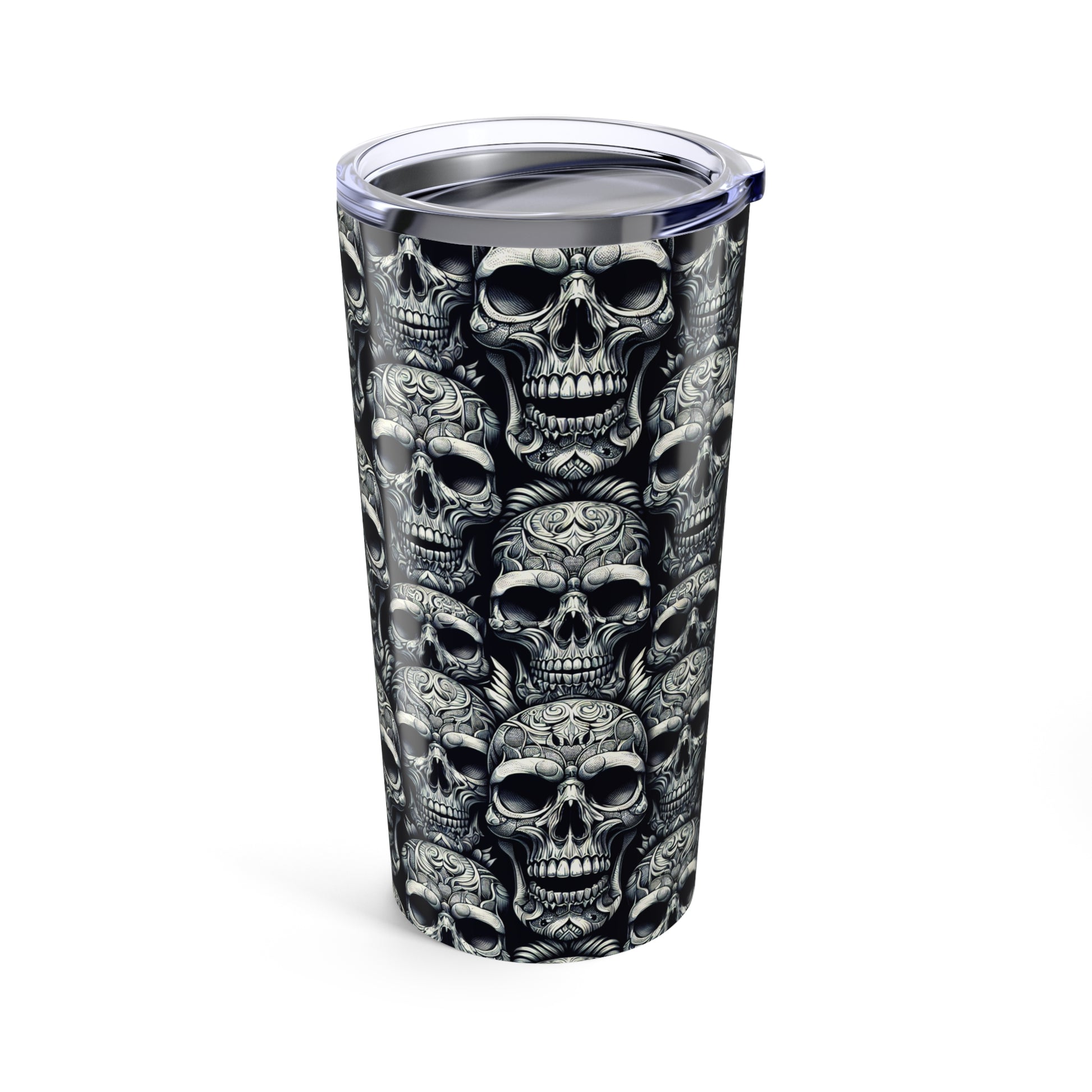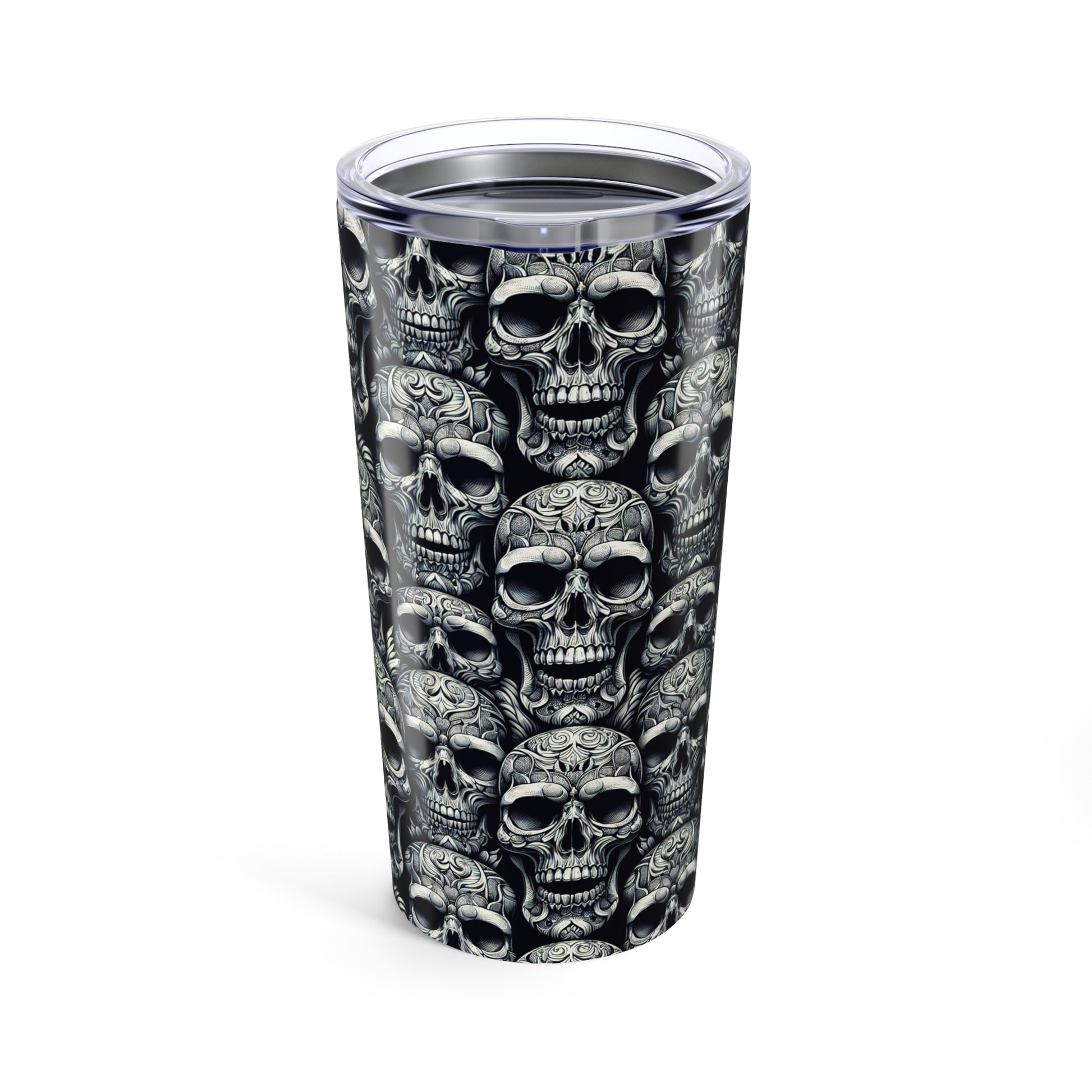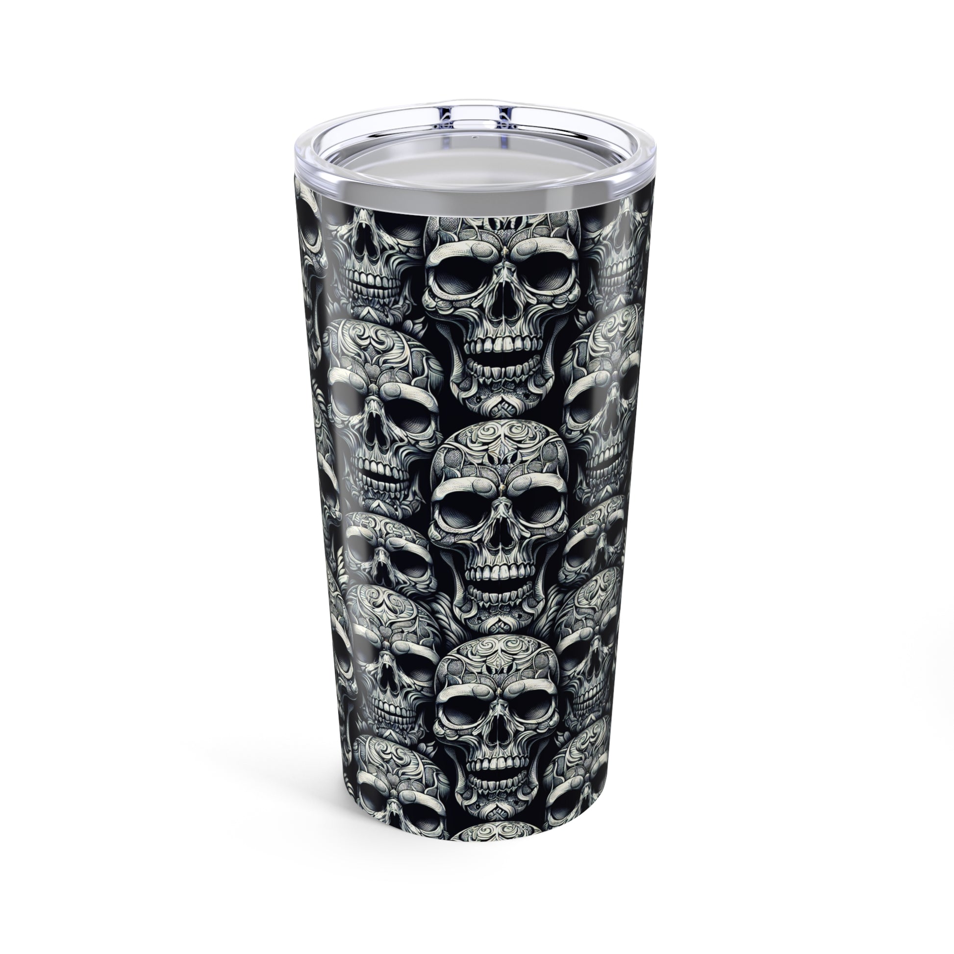 This stainless steel tumbler features a striking black and white skull pattern, giving off a bold and edgy vibe.