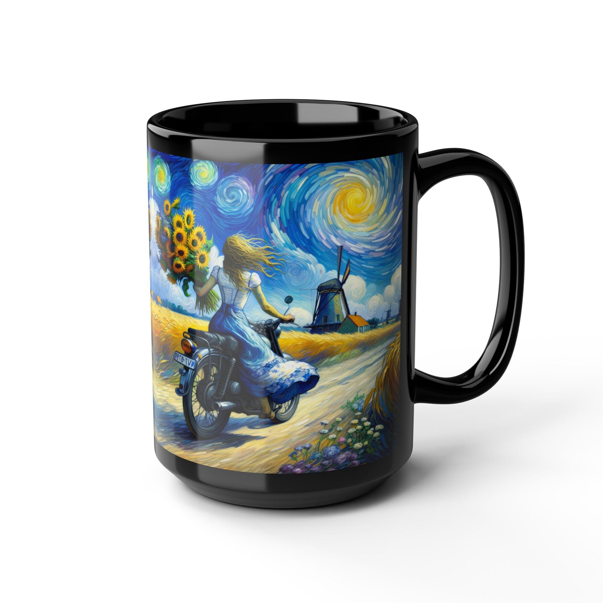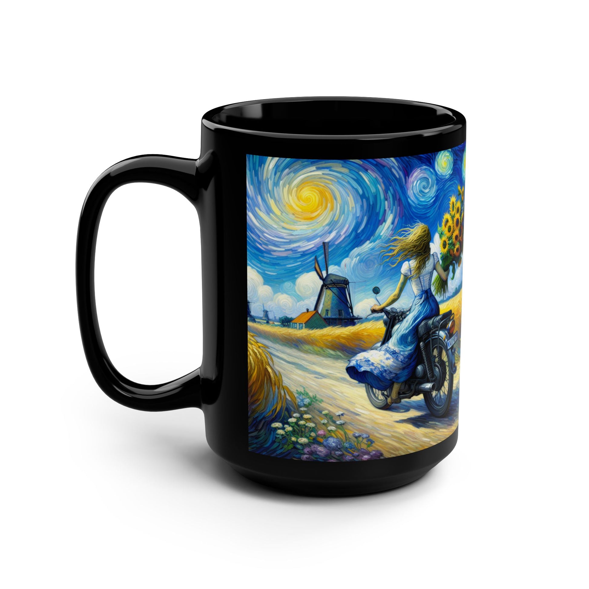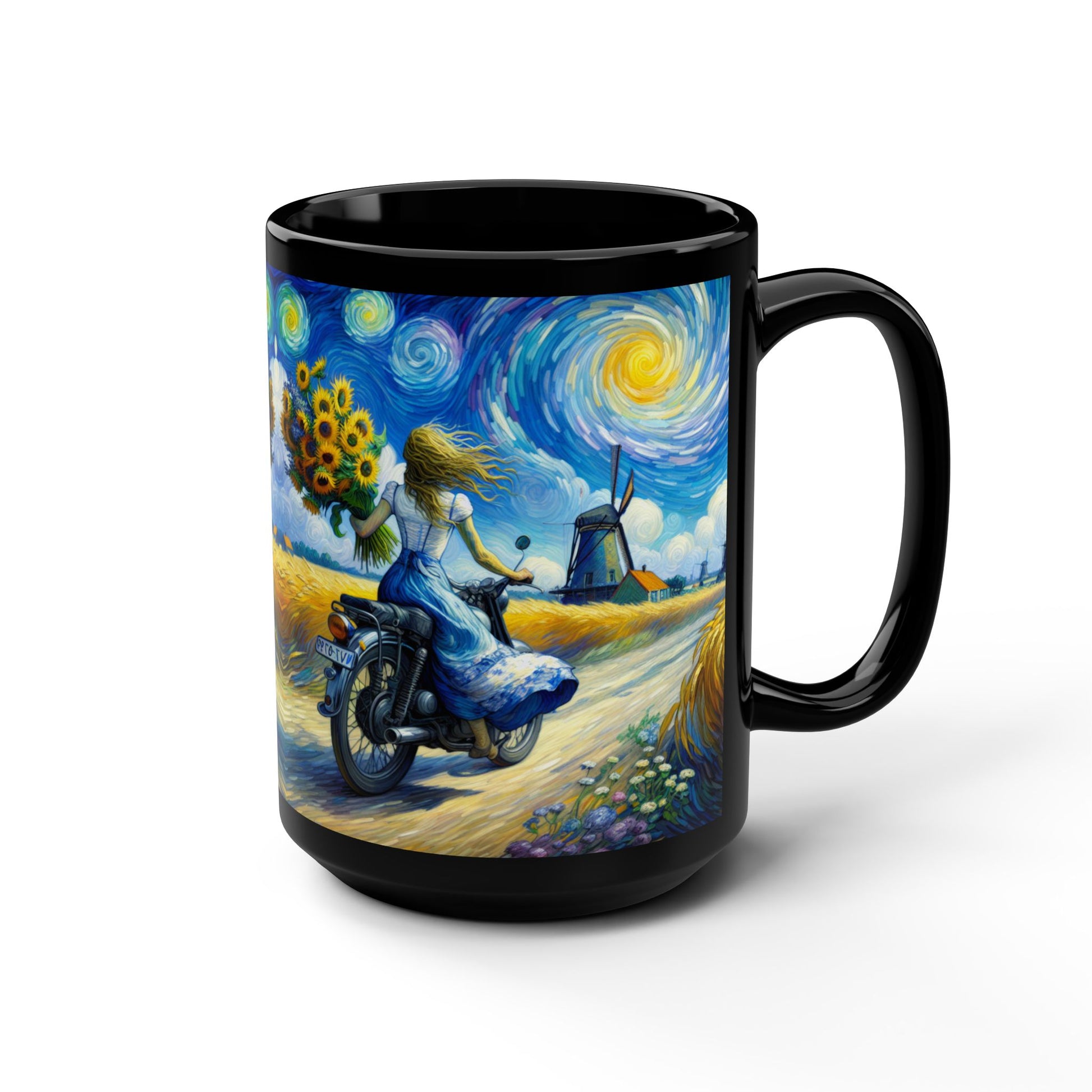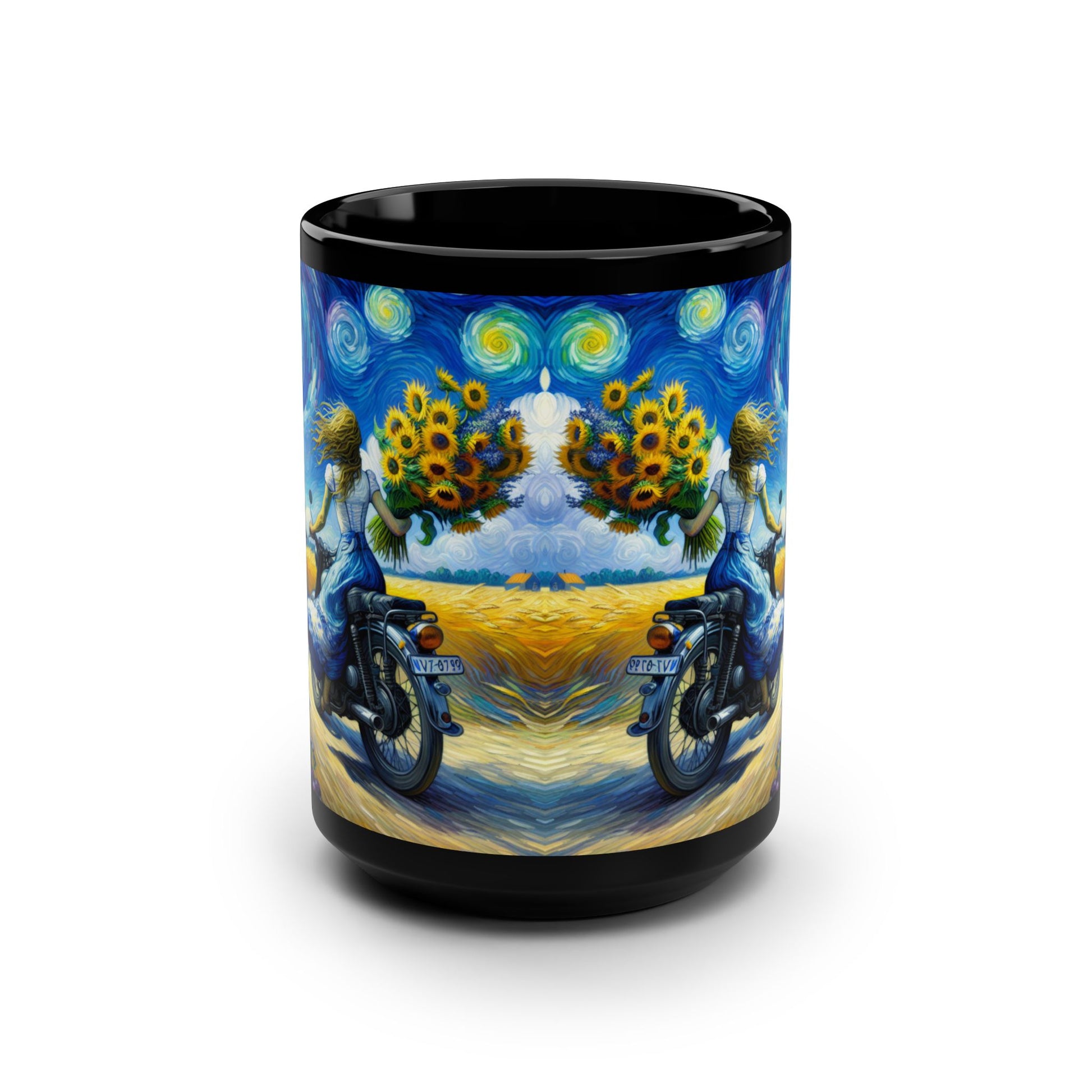 Van Gogh Inspired Artistic 15oz Black Mug - Vintage Inspired Sunflower & Motorcycle Design