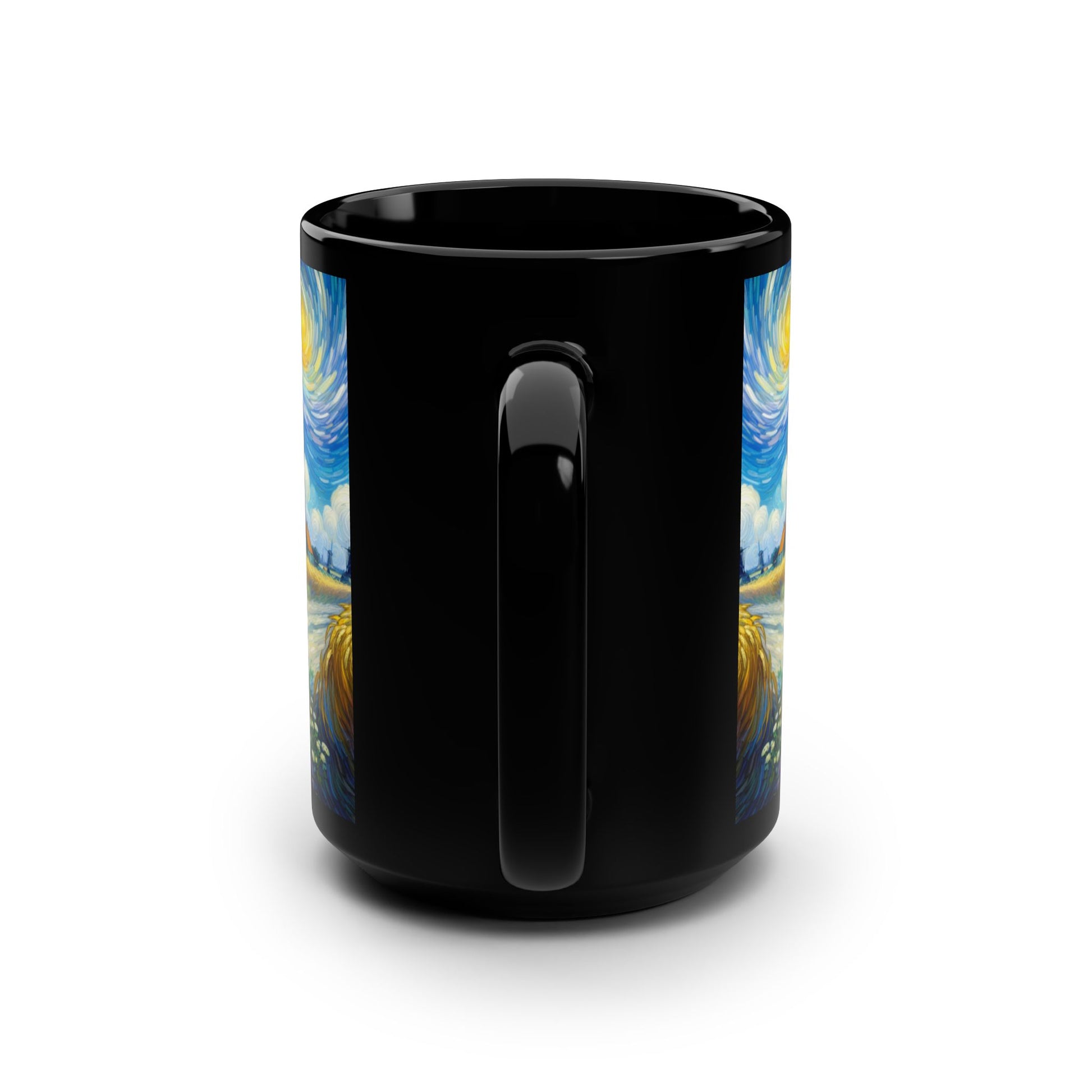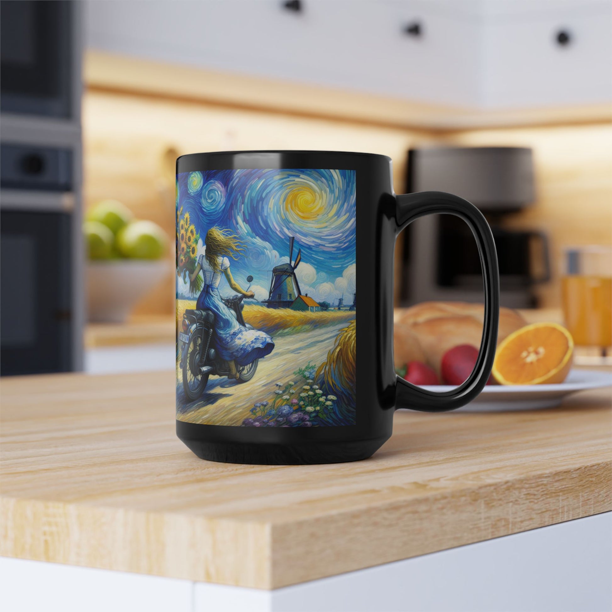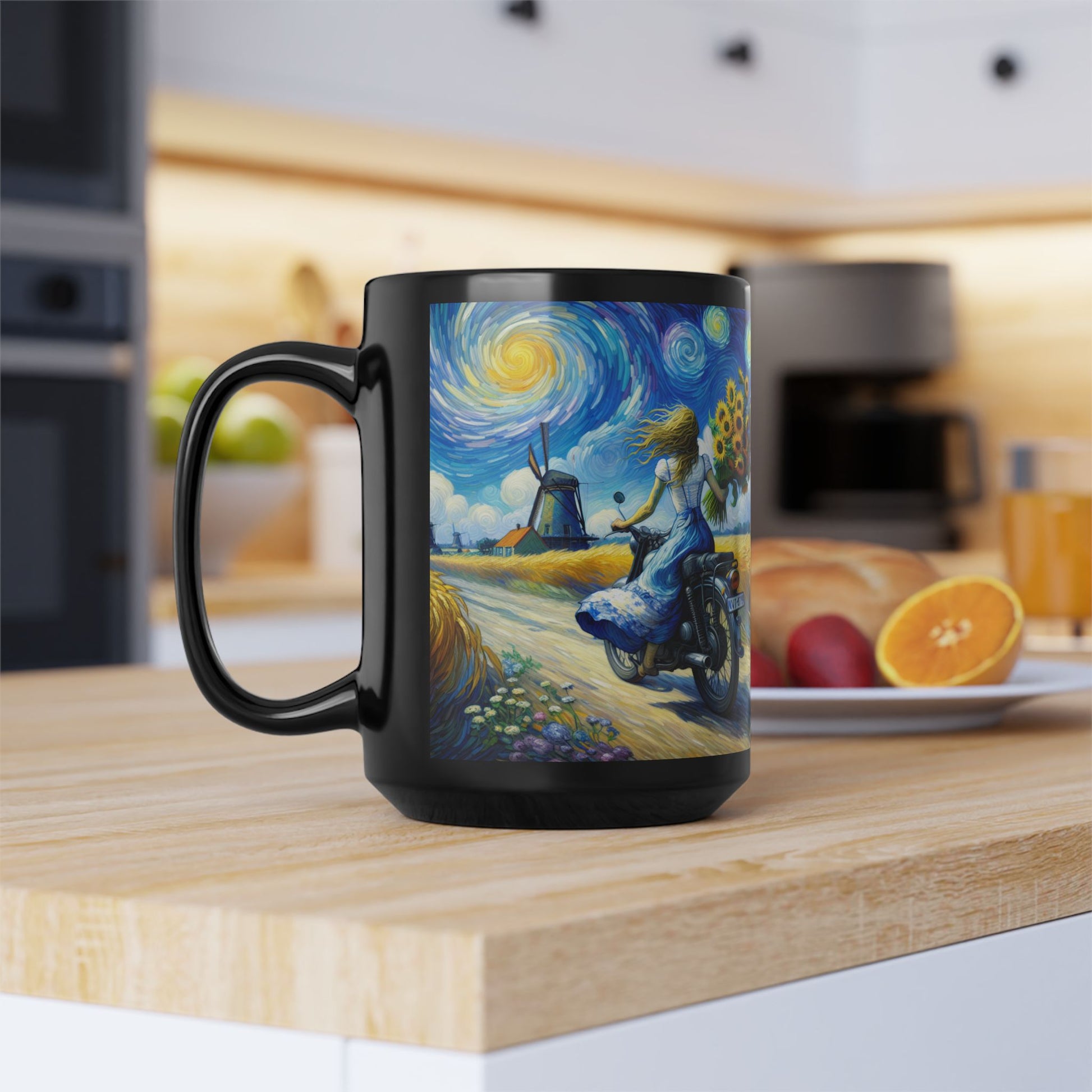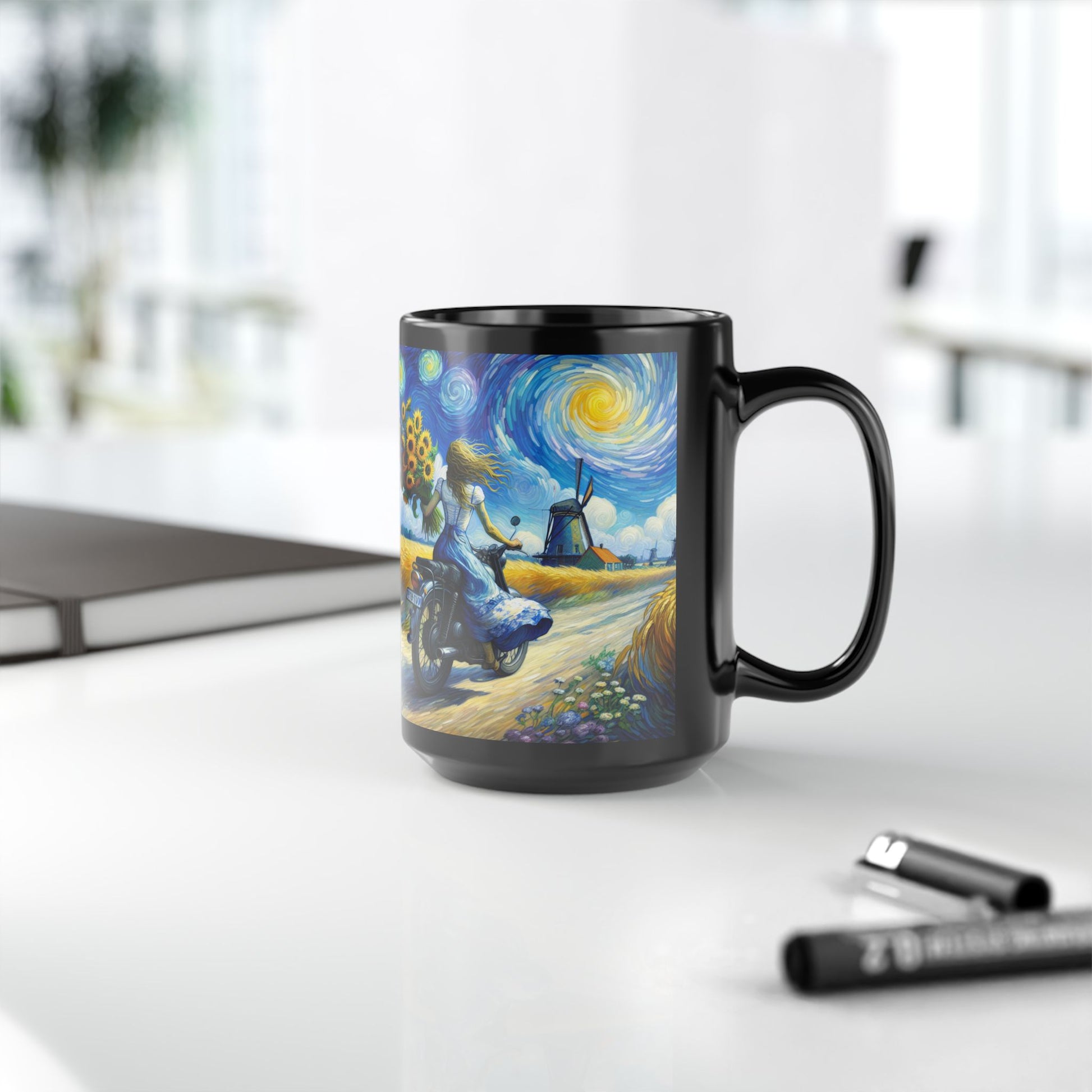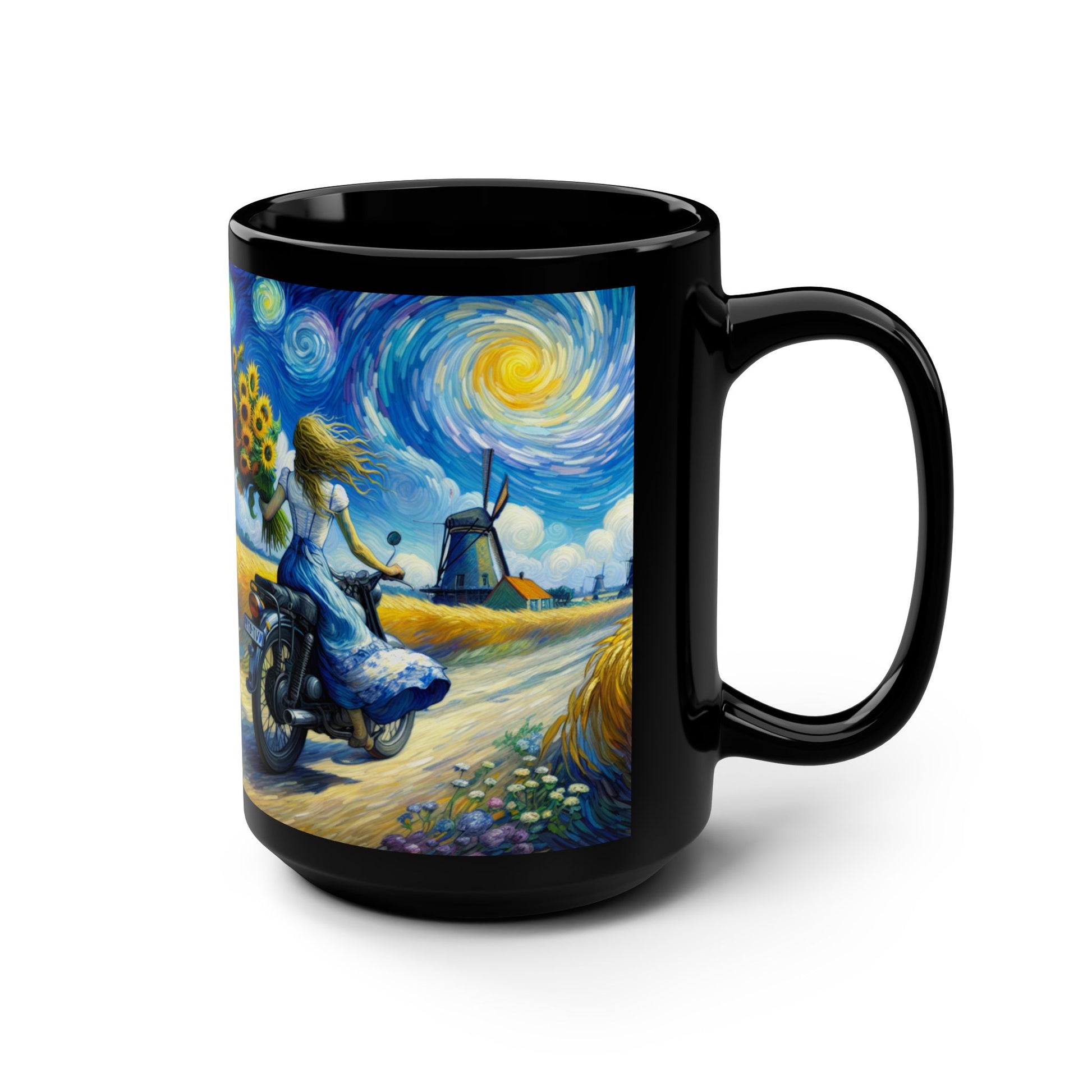 Van Gogh Inspired Artistic 15oz Black Mug - Vintage Inspired Sunflower & Motorcycle Design