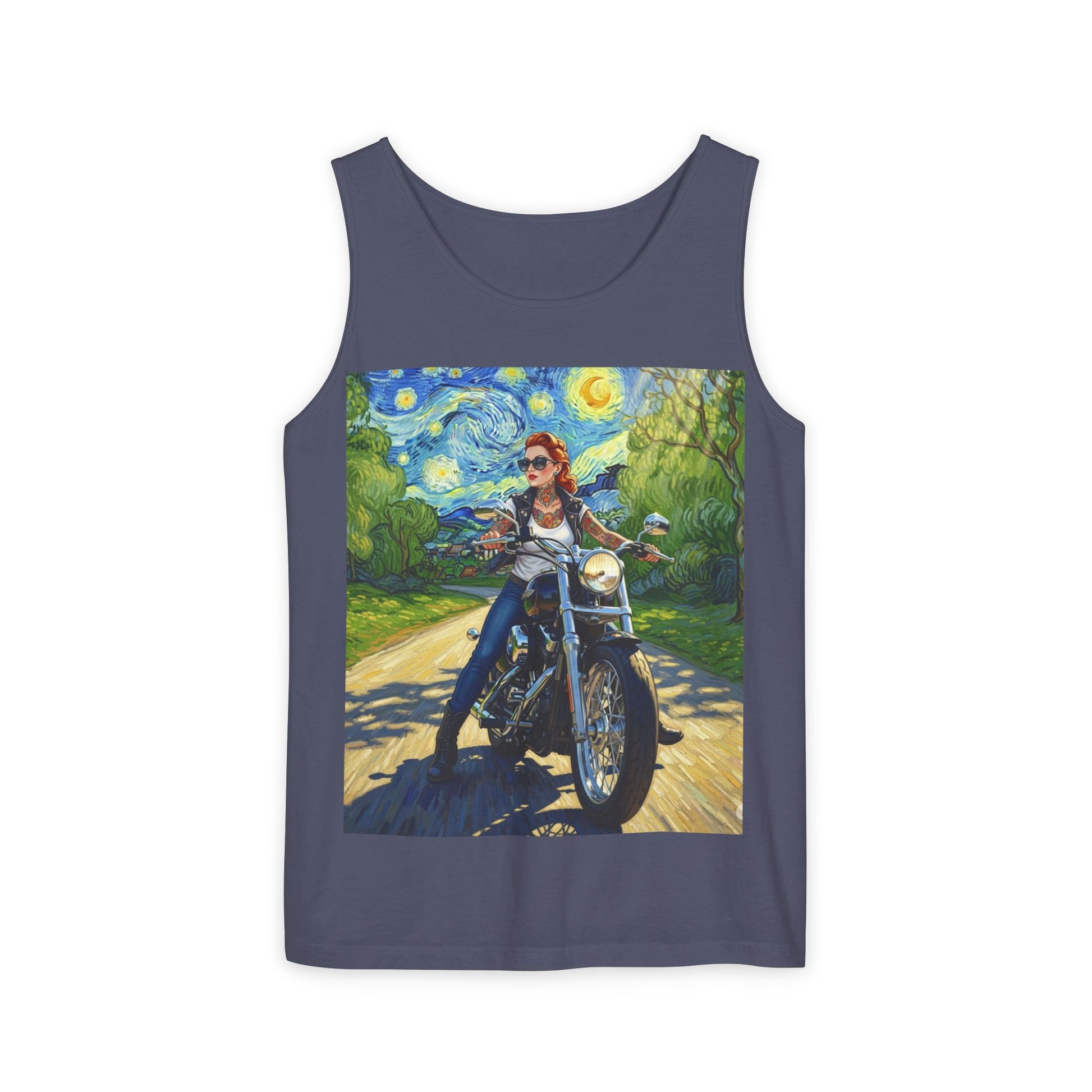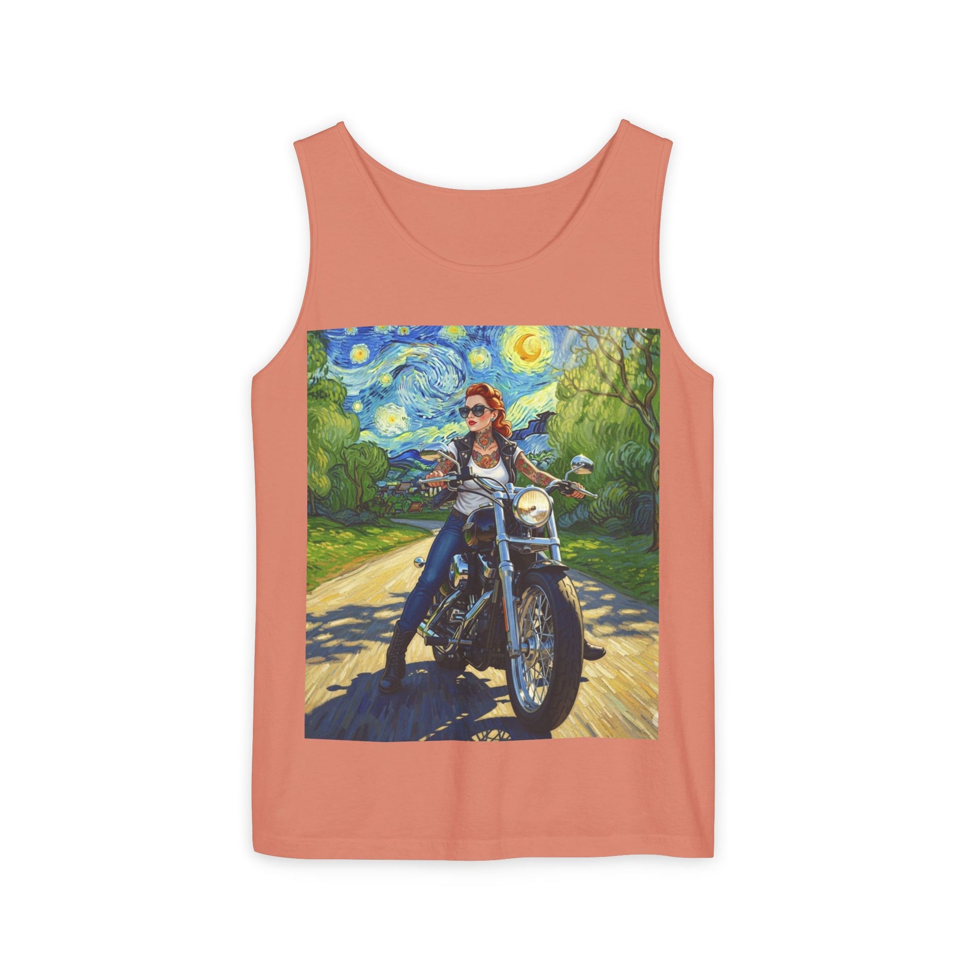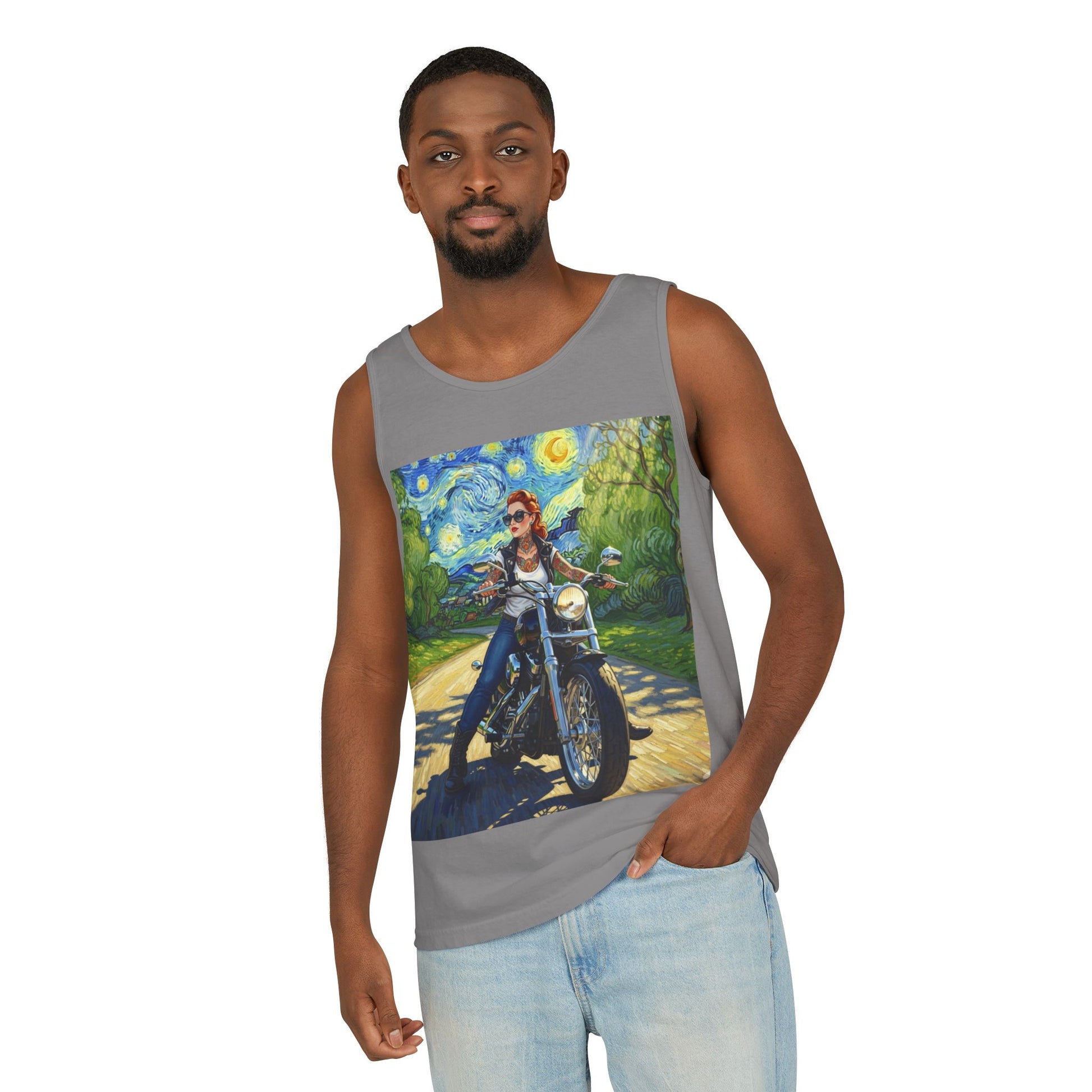 Vibrant Motorcycle Art Tank Top, Unisex Summer Tee, Biker Gift, Vintage Style Clothing, Casual Throwback Fashion, Perfect for Rides